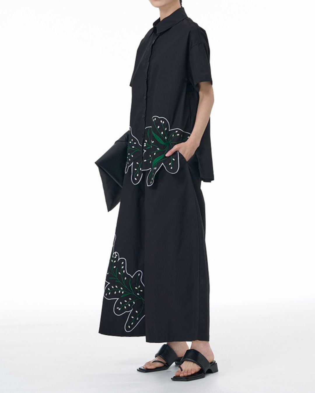 Botanical-Embroidered Cotton Short Sleeves Shirt