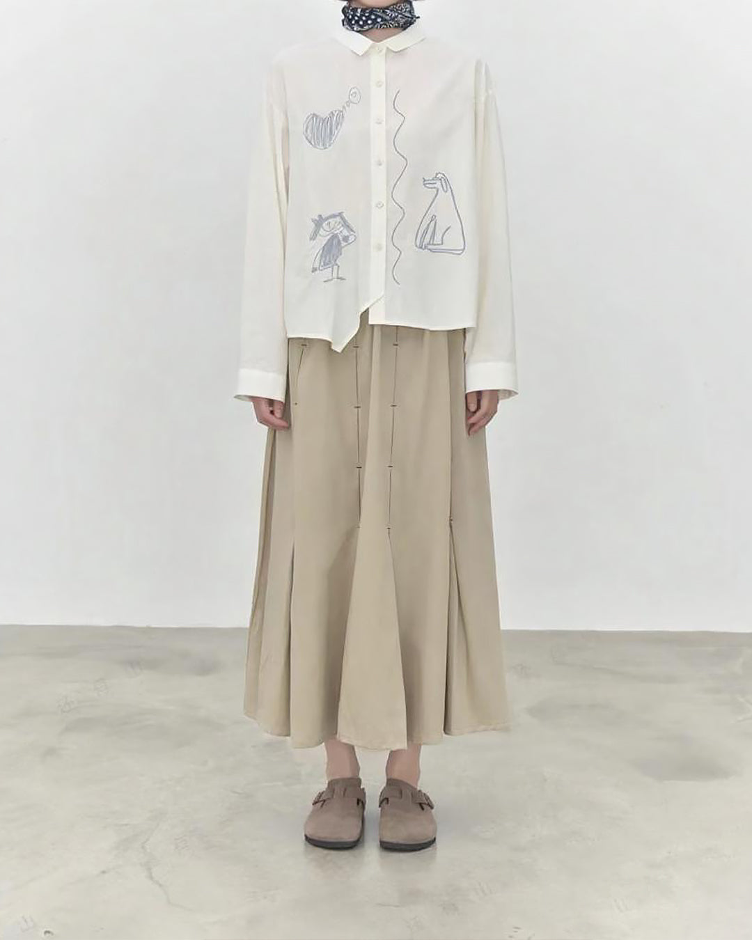 Cotton Shirt with Irregular Hem and Abstract Dog & Figure Embroidery