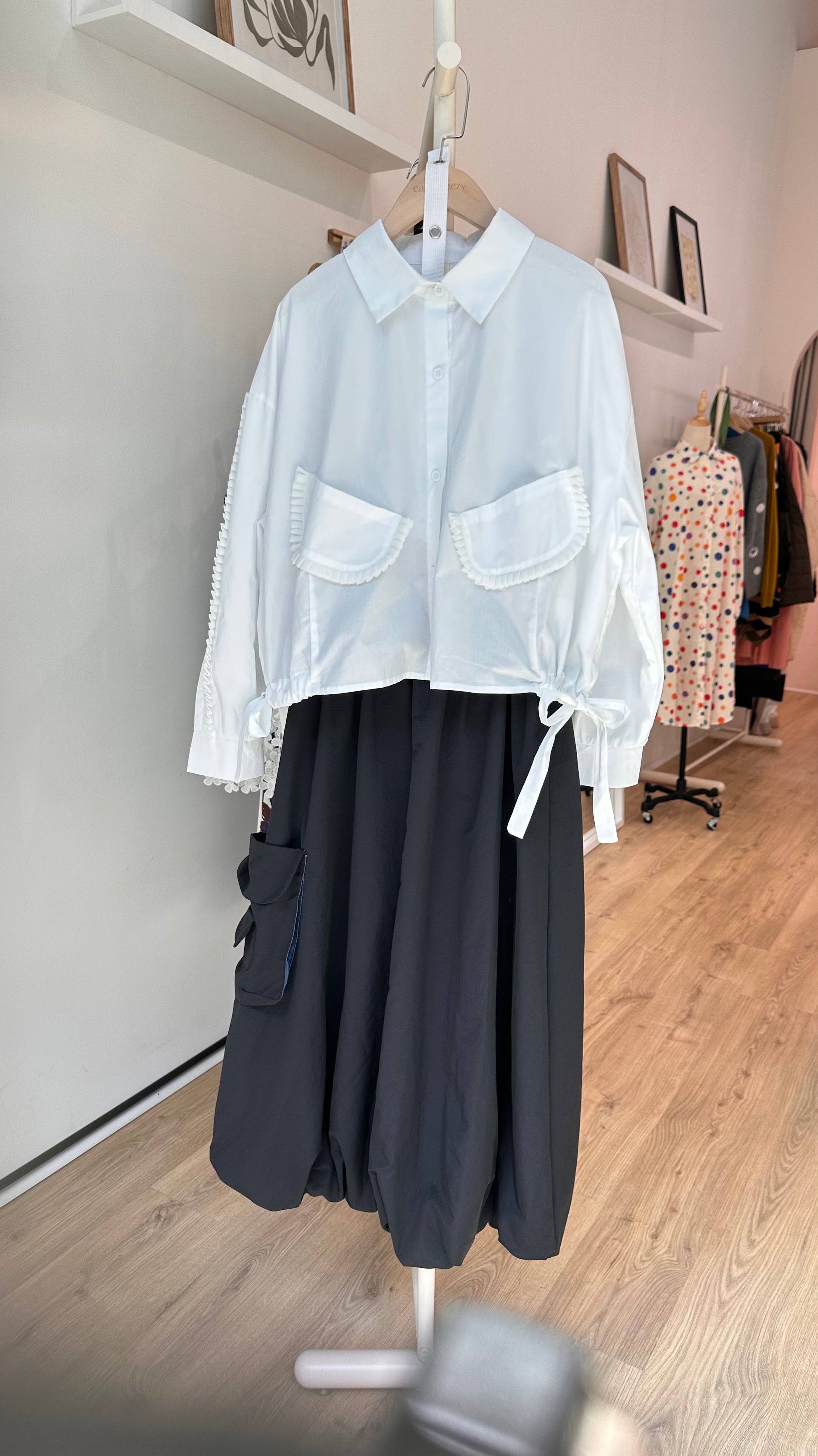 A subtle yet striking detail is the use of denim fabric on the side of the bag, creating a stylish contrast. Crafted from a sporty, wrinkle-resistant fabric, the skirt maintains its shape and structure throughout the day.