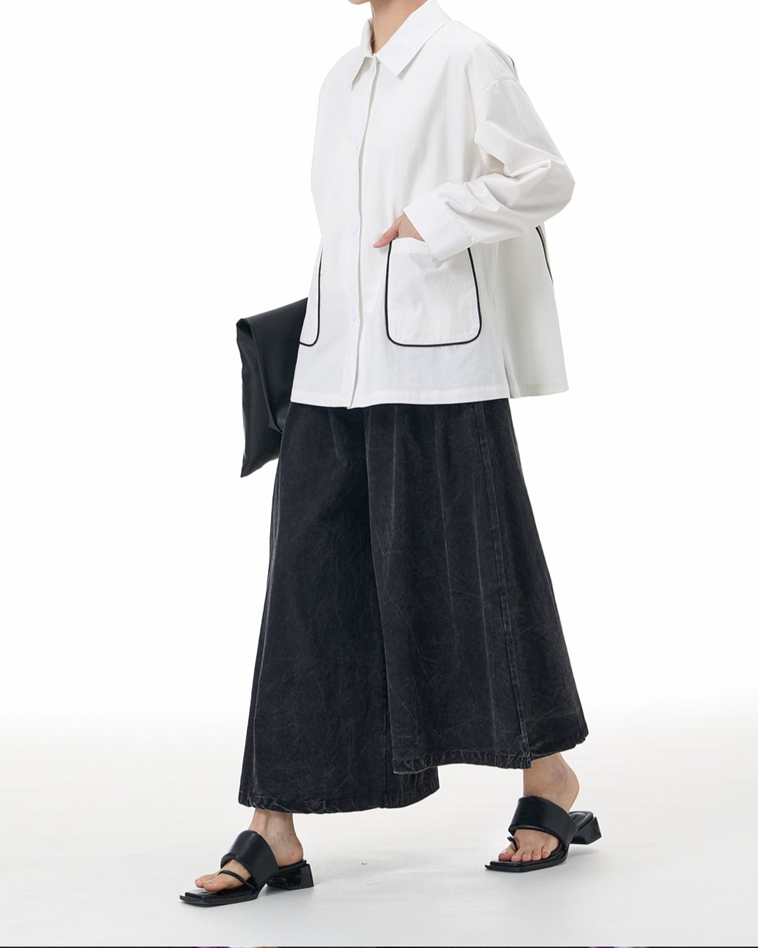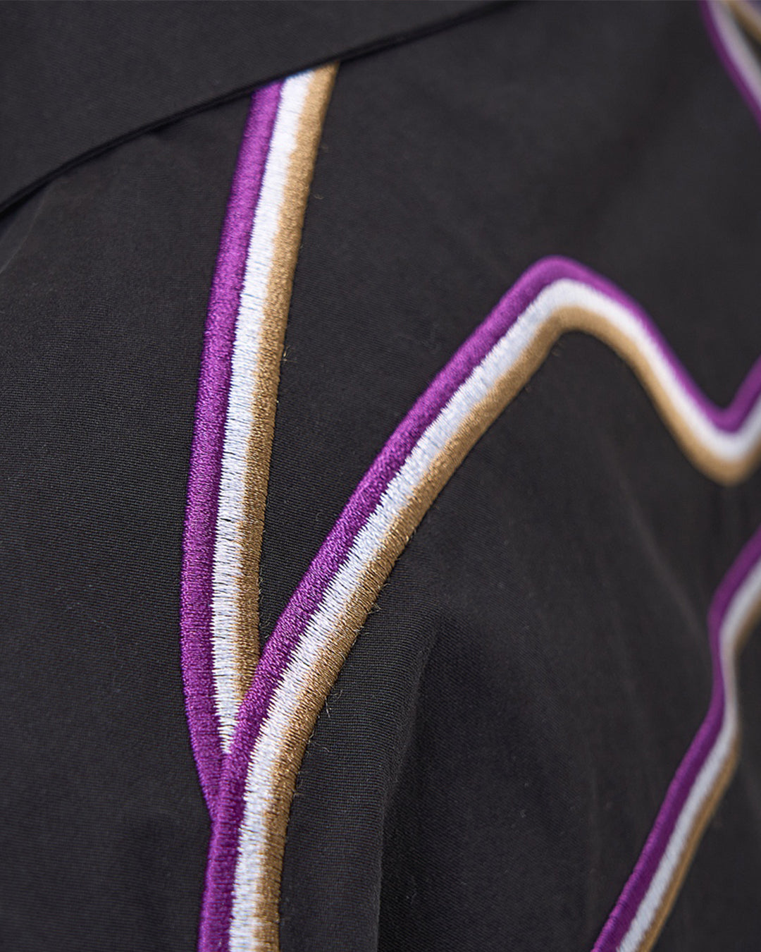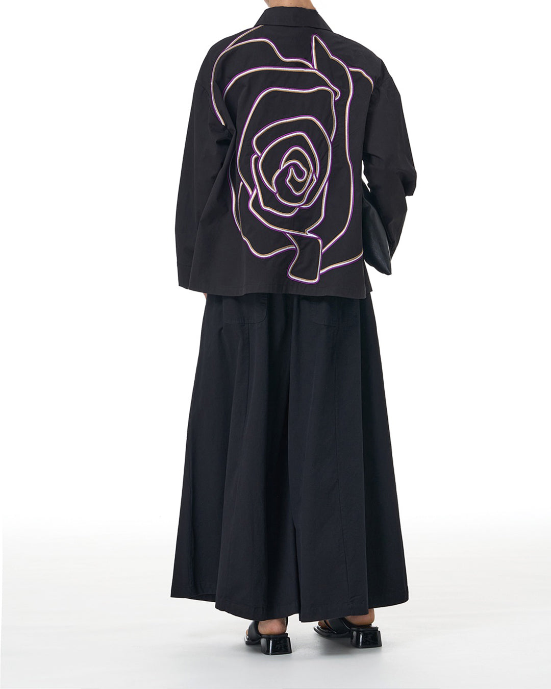 An oversized rose embroidery blooms across the back of this shirt, stitched in three shades to give life, depth, and presence.